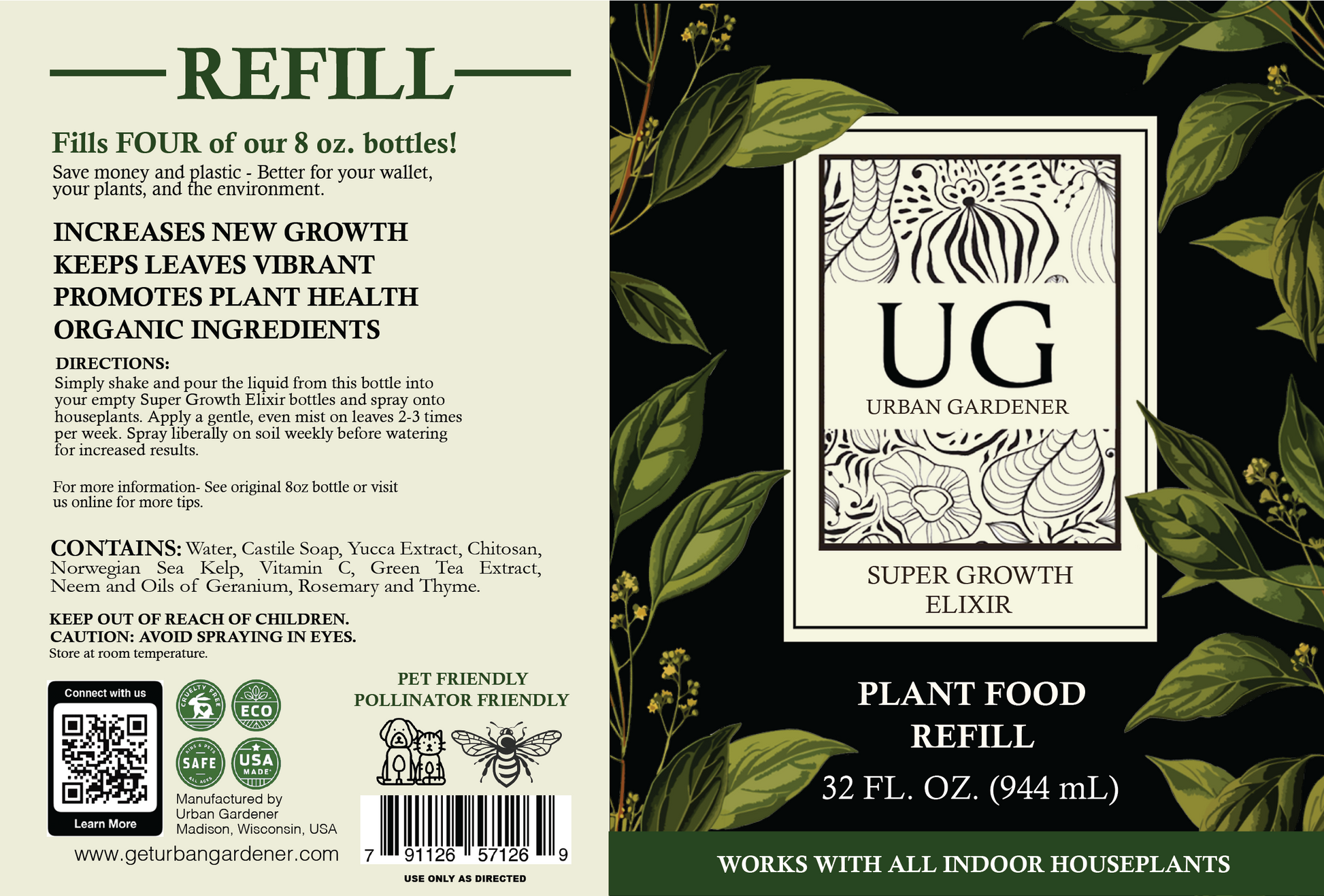 Super Growth Elixir is not simply a fertilizer, plant food, or insect spray but rather an easy-to-use balanced total care solution. Regular use gently coaxes health and brilliance out of even your most finicky plants and is safe to use around kids and pets when used as directed. Prepare to see new leaves sprouting on the happiest versions of your plants.